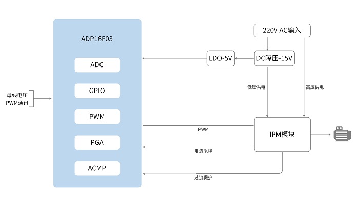 ADP16F03搭載16位定點DSP內核(主頻150MHz,哈佛總線結構),集成運算加速單元(支持除法、開方和帕克變換等指令),高效運行單電阻無感FOC算法,實現微秒級電機控制關鍵運算,為壓縮機與外風機協同調節提供強力算力保障。